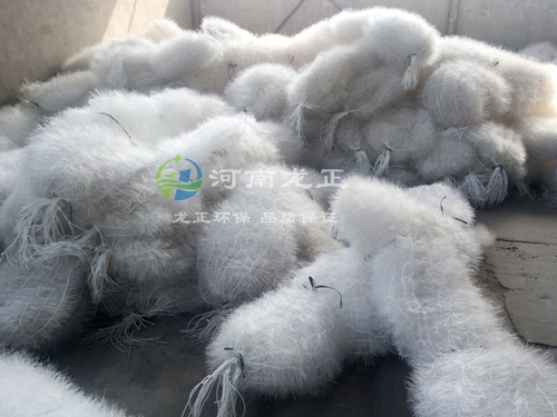立體彈性填料篩選了聚烯烴類和聚酰胺中的幾種耐腐、耐溫、耐老化的品種,混合以親水、吸附、抗熱氧等助劑,采用特殊的拉絲,絲條制毛工藝,將絲條穿插固著在耐腐、高強(qiáng)度的中心繩上,由于選材和工藝配方精良,剛?cè)徇m度,使絲條呈立體均勻排列輻射狀態(tài),制成了懸掛式立體彈性填料的單體,彈性填料在有效區(qū)域內(nèi)能立體全方位均勻舒展?jié)M布,使氣、水、生物膜得到充分混滲接觸交換,生物膜不僅能均勻的著床在每一根絲條上,保持良好的活性和空隙可變性,而且能在運(yùn)行過(guò)程中獲得愈來(lái)愈大的比表面積,又能進(jìn)行良好的新陳代謝。